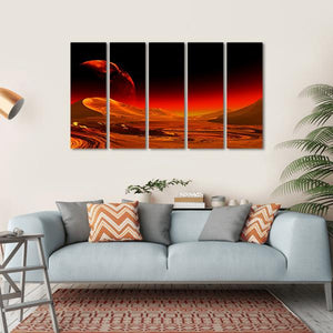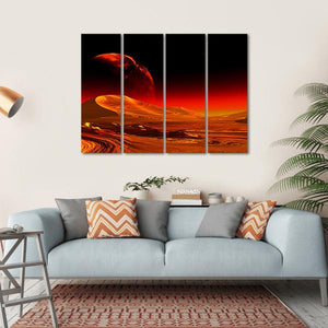 Explore the otherworldly landscape of an alien planet with this striking canvas art. Featuring a large, red celestial body and dramatic canyons beneath a fiery orange sky, it evokes a sense of desolation and intrigue. Perfect for those who appreciate sci-fi and modern decor.