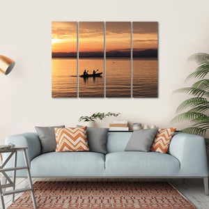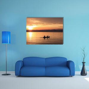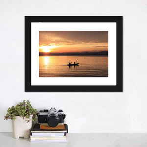 This captivating canvas art features two kayakers gliding through calm waters at sunset. With warm hues of orange, gold, and brown, it evokes a serene and tranquil atmosphere, making it a beautiful addition to any space.