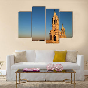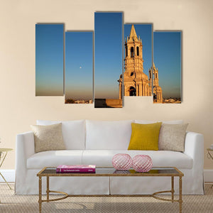 A photorealistic cityscape that centers on a church bell tower in Arequipa, set against a clear sky with the moon and a distant city skyline. Warm blue, tan and gold tones create a serene, historic mood that suits modern or classic room decor.