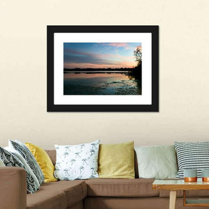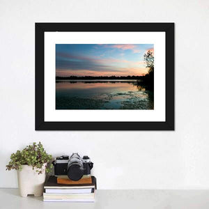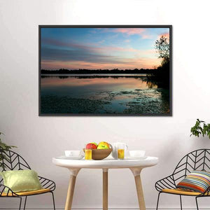 Secret Lake Park At Sunset Canvas Wall Art captures a photorealistic lake at sunset. Soft blues, pinks and oranges fill a clouded sky and mirror in textured water dotted with aquatic plants, while silhouetted trees trace the shoreline for a calm, serene atmosphere. The piece fits well in modern or nature-inspired rooms.