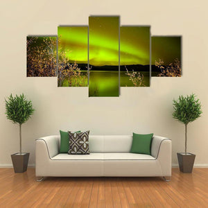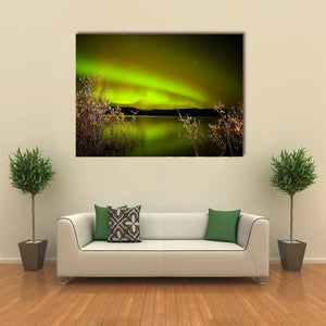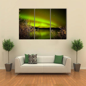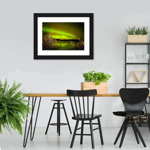 This canvas art features the breathtaking aurora borealis illuminating a serene lake under a starry night sky. With its lush greens and warm yellows reflecting on the water, it brings a magical and awe-inspiring atmosphere to any space.