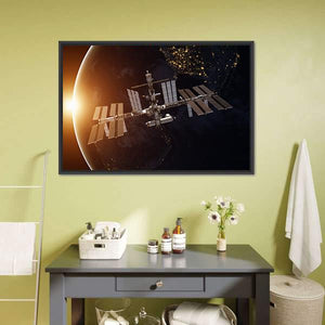 This canvas art features a breathtaking view of the International Space Station hovering over a brightly lit Earth, showcasing a palette of dark blue, orange, white, and yellow. Its realistic depiction evokes a sense of awe and wonder, perfect for any space enthusiast looking to bring a touch of the cosmos into their decor.