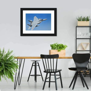 Depicts an F-15 Eagle fighter jet from a dynamic, high perspective, rendered in realistic detail with a gray and blue palette and a red circular insignia on the wings. The image carries a powerful, swift mood and works well in modern or military-themed rooms.