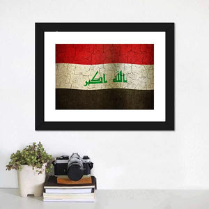 Iraq Flag Canvas Wall Art presents the Iraqi flag with vintage typography and short phrases, rendered in red, white, green and black with a cracked, weathered texture. The symmetrical composition creates a bold, classic, patriotic mood. It pairs well with modern home decor and room decor.