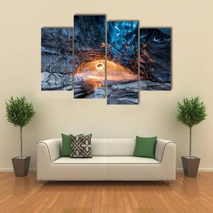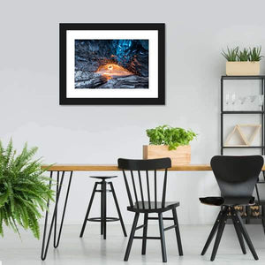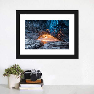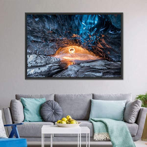 Experience the magic of an ice cave illuminated by a glowing orb of fire. This dramatic piece captures the intense beauty of nature, featuring intricate ice formations and mesmerizing water reflections in a striking color palette of blue, orange, white, and grey.