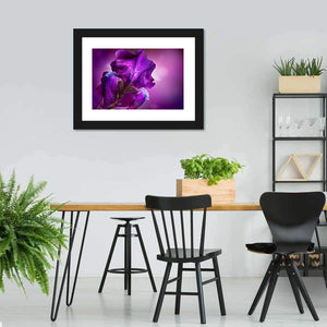 This canvas print features stunning close-up imagery of purple iris flowers adorned with delicate water droplets. Its serene and elegant composition brings a touch of nature's beauty to any space.