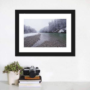 This canvas wall art captures the serene beauty of the Isar River, surrounded by snow-covered trees and a gravel shore. The tranquil scene, featuring gentle snowflakes and water reflecting the trees, brings a quiet, calming presence to any room.