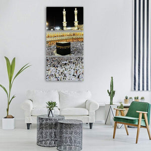 Depicts the Kaaba and surrounding mosque from an aerial perspective, with pilgrims in white gathered at night. The photo-realistic print uses black, white, gold and brown tones to create a reverent, crowded, spiritual atmosphere. Suited to prayer rooms or modern living spaces seeking faith-inspired wall decor.