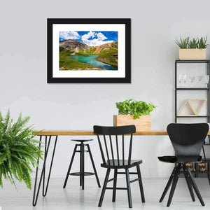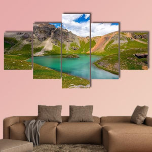 A photorealistic view of a mountain lake in the San Juan Mountains, featuring turquoise water, rocky peaks and fluffy white clouds. The scene feels serene and majestic with green hills and cool blues—suits modern or nature-inspired rooms and living spaces.