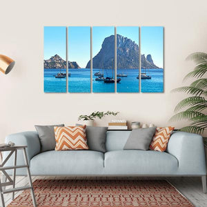 Bring a touch of serenity to your space with the Island of Es Vedra canvas wall art. This photorealistic piece captures a bright, sunny day by the ocean, featuring several sailboats anchored near a large rocky island under a clear blue sky. It's a perfect addition for those who appreciate scenic landscapes.