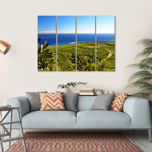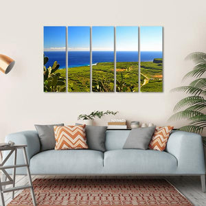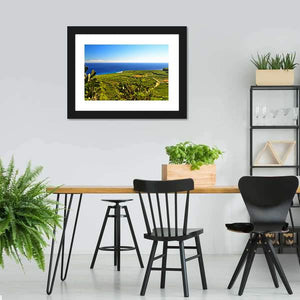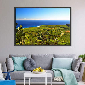 This vibrant canvas features a serene landscape of the ocean and coastline, framed by green hills and prickly pear cacti. Its realistic style and rich colors of blue, green, and brown create a refreshing atmosphere, making it a perfect addition to any room decor.