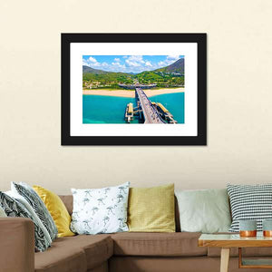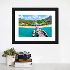 An aerial view of a pier, beach and ocean in Sanya, China, captured in a photorealistic, vibrant palette of blues, greens, tans and whites. The scene feels tropical and serene, with people walking the pier and boats docked near lush green hills — well suited to coastal or modern room decor.