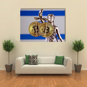 This canvas art features the Israel flag intertwined with Bitcoin, symbolizing a blend of national pride and modern cryptocurrency. The serious mood and golden, blue, and white palette create a striking focal point for any space.