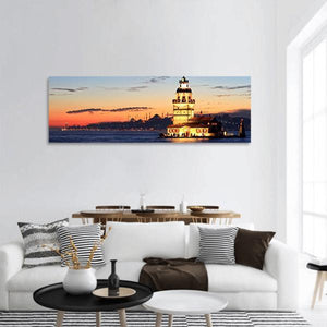 Istanbul’s Maiden Tower and the waterfront skyline appear here at sunset, with a softly glowing lighthouse and distant silhouettes. The wide-angle, panoramic scene pairs warm oranges with cool blues for a serene, atmospheric feel. Suited to modern living spaces, it works well as a calm focal piece in a living room, hallway, or office.