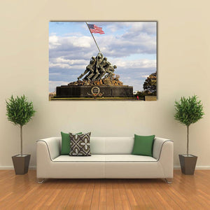 This canvas depicts the Iwo Jima memorial, flag, and soldiers in a realistic landscape with depth and rule-of-thirds composition. The blue, gray, brown, and green palette creates a patriotic, solemn, and heroic atmosphere. Suited to modern homes or offices as thoughtful wall decor.