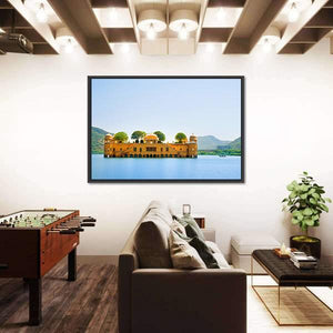 Experience the serene beauty of Jal Mahal, a stunning palace set on tranquil waters, surrounded by lush mountains. This photorealistic artwork captures the intricate golden domed roof and arched windows, inviting a peaceful atmosphere to your space.