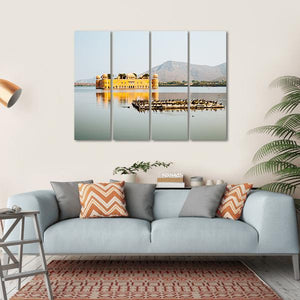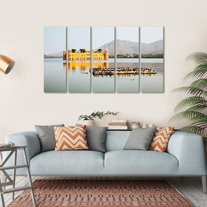 This canvas art features the enchanting Jal Mahal palace set against tranquil waters, reflecting its beauty in the calm lake. With a serene palette of yellows, blues, and greens, it adds a touch of nature-inspired elegance to any space.