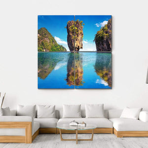 This canvas artwork captures the serene beauty of James Bond Island, featuring majestic rock formations rising from the clear blue ocean. The lush green vegetation and the vibrant palette of blues and browns create a tropical atmosphere, perfect for enhancing any nature-inspired décor.