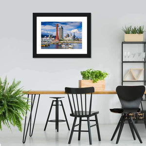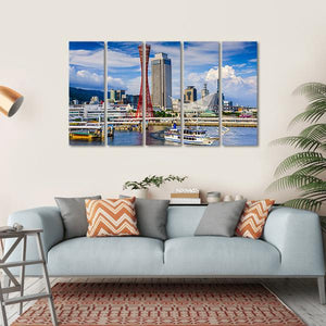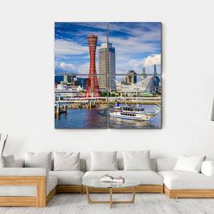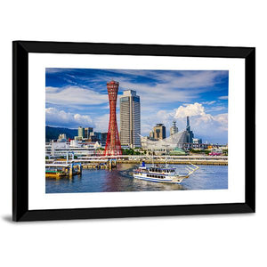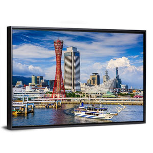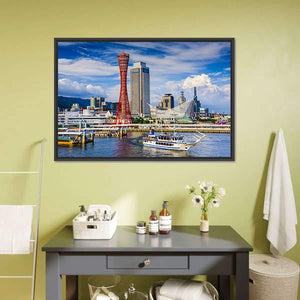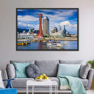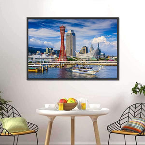 This canvas art captures the vibrant energy of a Japanese city skyline, featuring a striking red lattice tower and a graceful white passenger boat. The lively atmosphere and beautiful palette of blue and red evoke a sunny day by the harbor, making it a perfect addition to any modern décor.