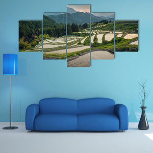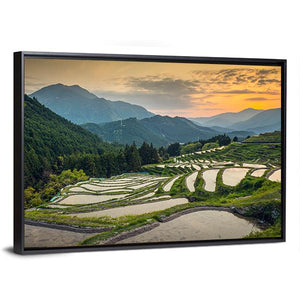 Capture the serene beauty of Japan's rice terraces with this stunning canvas wall art. Featuring a tranquil sunset over lush green fields and majestic mountains, it brings a picturesque touch to any space.