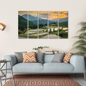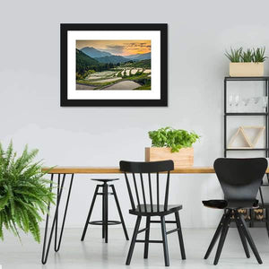 Experience the serene beauty of Japanese rice terraces with this captivating canvas wall art. Featuring stepped paddies set against layered mountains and a dramatic sunset sky, it invites a tranquil atmosphere into your home.