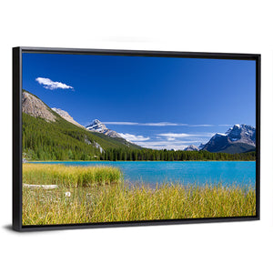 The Jasper National Park Alberta Canvas Wall Art captures a serene landscape featuring majestic mountains, a bright blue lake, and lush forests. This artwork radiates peaceful vibes, making it a beautiful addition to any nature lover's space.