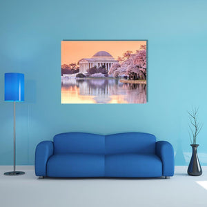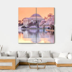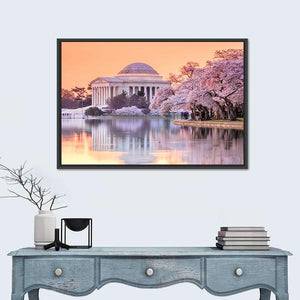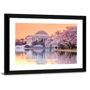This canvas art captures the Thomas Jefferson Memorial framed by vibrant cherry blossoms, reflecting beautifully in the tidal basin. Its serene mood and warm palette of orange and pink create a peaceful atmosphere, making it an ideal addition to any landscape art collection.
