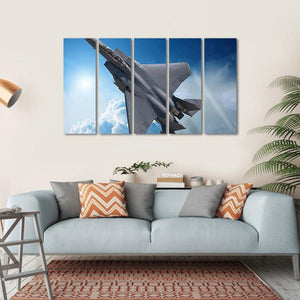 This striking canvas features a dynamic view of a fighter jet soaring through a blue sky, set against streaks of light and fluffy clouds. The bold colors and realistic style evoke a sense of power and adventure, making it a captivating addition to any wall decor.