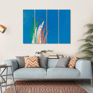 This canvas art captures the vibrant spectacle of fighter jets flying in formation, trailing the colors of the Indian flag. The dynamic palette of blue, green, orange, and red creates a celebratory and patriotic atmosphere, making it a striking addition to any wall.