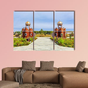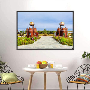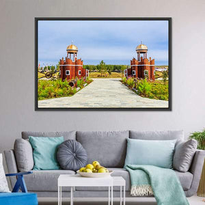 A serene grassland scene with a stone pathway leading to twin wooden towers topped with gold domes, set among blooming flowers and trees. The symmetrical composition and calm green, blue and gold palette create a welcoming, rustic mood that fits natural or modern home decor.