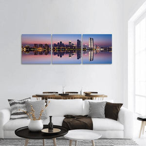 Jinji Lake in Suzhou captures a panoramic city skyline mirrored across calm water at twilight. Modern architecture, blue-purple and orange tones, and a reflective composition create a tranquil yet vibrant mood that suits contemporary living rooms or office spaces.