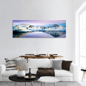 A panoramic photographic canvas of Jokulsarlon Glacier Lagoon, showing blue-hued icebergs floating on a calm lake with distant mountains and open sky. The scene feels serene, cold, and vast, with clear reflections that work well in modern rooms or offices.