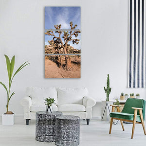 This realistic canvas print features two prominent Joshua trees set against rocky desert terrain and a wispy blue sky, evoking a serene, arid mood. The natural palette of browns, blues, tans, and greens makes it a good fit for modern, nature-inspired rooms and quiet spaces.