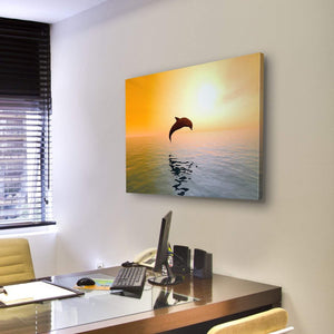 This vibrant canvas art captures a dolphin jumping against a stunning sunset, reflecting gracefully on the water. Its modern and realistic style makes it a serene addition to any room.