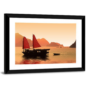 This canvas features a two-masted boat with red sails drifting peacefully in the warm hues of a Vietnamese sunset. The tranquil scene captures the beauty of Ha Long Bay, inviting a serene ambiance into any space.