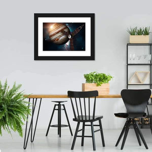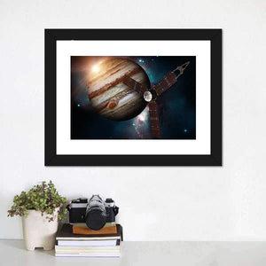 Dive into the cosmic beauty of Jupiter with this vibrant canvas print featuring the planet and the Juno space probe. The breathtaking palette of oranges, browns, blues, and blacks captures the awe-inspiring essence of the universe, highlighting the Great Red Spot and the solar panels on the spacecraft.