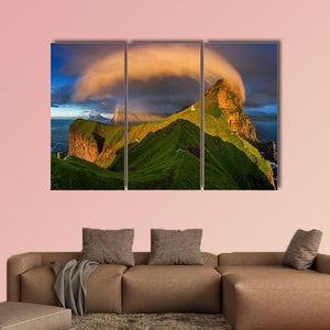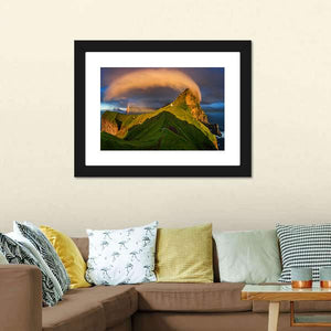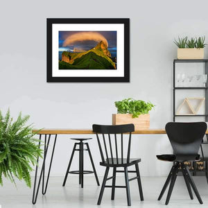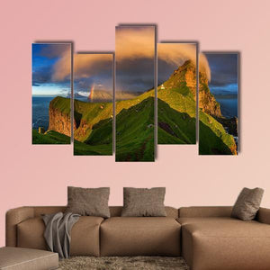 Kalsoy Island & Lighthouse depicts a Faroe Islands scene with a lighthouse, rugged mountains and a rainbow arcing through dramatic cloud formations. Green, orange, blue and brown tones with strong dramatic lighting create an awe‑inspiring mood that suits modern decor.