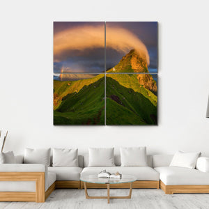 Immerse yourself in the breathtaking beauty of Kalsoy Island with this canvas wall art featuring dramatic mountains, cloud formations, and a hint of rainbow. The epic scene captures sunlight illuminating vibrant green grass, creating a sense of awe in any setting.