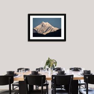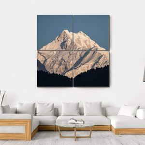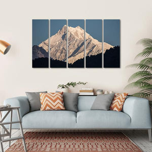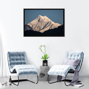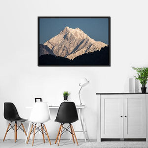 This captivating canvas features the majestic Kanchenjunga Peak, surrounded by a serene pine forest. The artwork captures the mountain peaks catching sunlight and shadows on the slopes, evoking a vast and tranquil atmosphere.