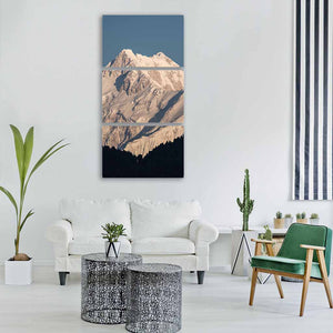 Capture the majesty of Kanchenjunga Peak with this stunning canvas art. Featuring a snow-capped mountain against a clear sky, it's a serene addition to your wall decor that harmonizes beautifully with nature. The silhouette of trees at the bottom adds depth to this grand landscape piece.