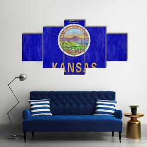 Kansas Flag Canvas Wall Art shows the centered state seal with a sunflower above and the gold "KANSAS" text beneath, set against a distressed blue field that includes mountains, plains, and oxen. The piece carries a vintage, rustic feel—patriotic and historical—and pairs well with rustic or Americana home decor.