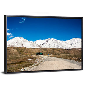 This canvas wall art captures the majestic snow-capped mountains of the Karakoram range, framed by a clear blue sky and fluffy white clouds. The eye-level view of a road with dark green vehicles adds a sense of adventure and vastness to your space.