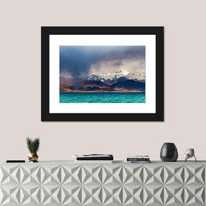 This canvas art captures the dramatic scene of Karakul Lake in Tajikistan, framed by imposing mountains and a stormy sky. The palette features deep blues, whites, and earthy browns, creating an awe-inspiring natural landscape perfect for any room.