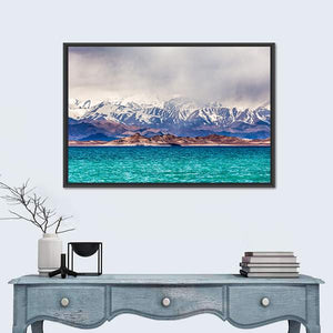 This canvas art features a serene view of Karakul Lake in Tajikistan, framed by majestic snow-capped mountains and rocky islands. The tranquil turquoise lake, set against a palette of blue, white, and grey, evokes a sense of vastness and calm.