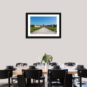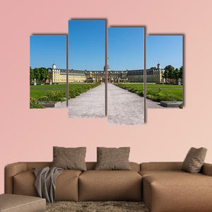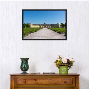 Karlsruhe Palace Canvas Wall Art shows the pale yellow palace facade with its many windows, centered at the end of a wide gravel path and flanked by neatly trimmed green lawns beneath a clear blue summer sky. The realistic, symmetric composition and strong leading lines create a grand, serene, bright atmosphere. Suited to modern home decor.