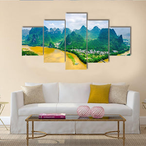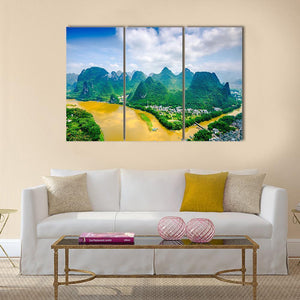 Li River In Rural Guilin shows a serene aerial view of a river winding through karst mountains and a small village. Rendered in a realistic style with greens, browns, blues and a cloudy sky, the print brings a calm, scenic, majestic mood to modern living spaces or a quiet study.