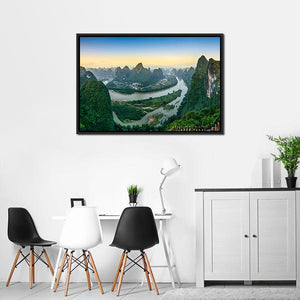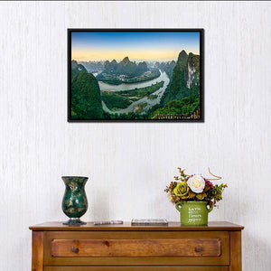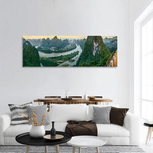Li River in Xingping spreads across a panoramic scene of karst mountains, a winding river and a small village, with a wooden railing along a ridge in the foreground. Soft greens, blues, grays and touches of yellow lend a serene, picturesque, and expansive mood. Works well in modern or nature-inspired spaces as a calm focal piece.