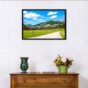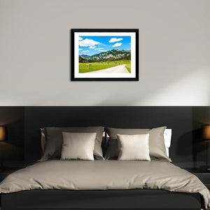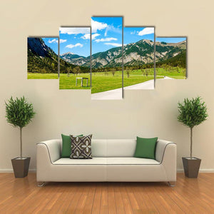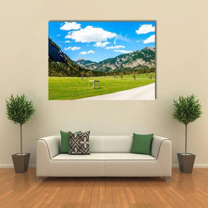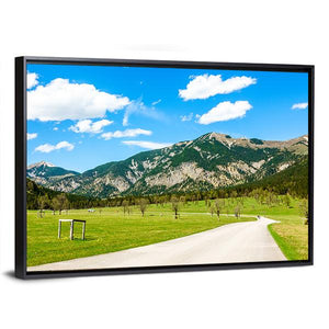 Karwendel Mountains Canvas Wall Art presents a peaceful, scenic panoramic landscape of mountains, a grassy field with small white rectangular structures, trees and a road that curves away to the right beneath a blue-gray sky. The realistic scene suits modern living rooms or entryways and fits spaces that favor nature-focused, open decor.