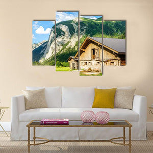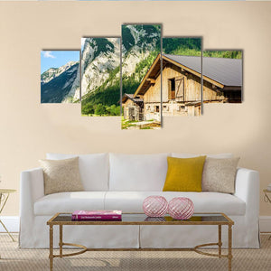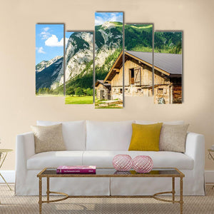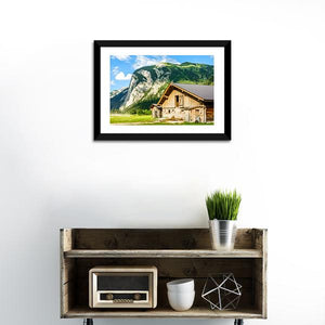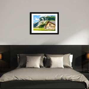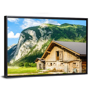 A weathered wooden barn sits in lush green fields below a steep, rocky mountain face under a bright blue sky dotted with white clouds. The composition feels peaceful and rustic, a calm landscape that works well in nature-focused living rooms or country-style spaces.