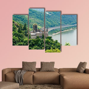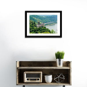 Katz Castle in Germany shows a realistic landscape of a stone castle on a hill beside a river, surrounded by dense green forest and soft summer blues. The composition feels picturesque, historic, and serene, and it suits nature-themed or classic room decor as part of a modern canvas collection.